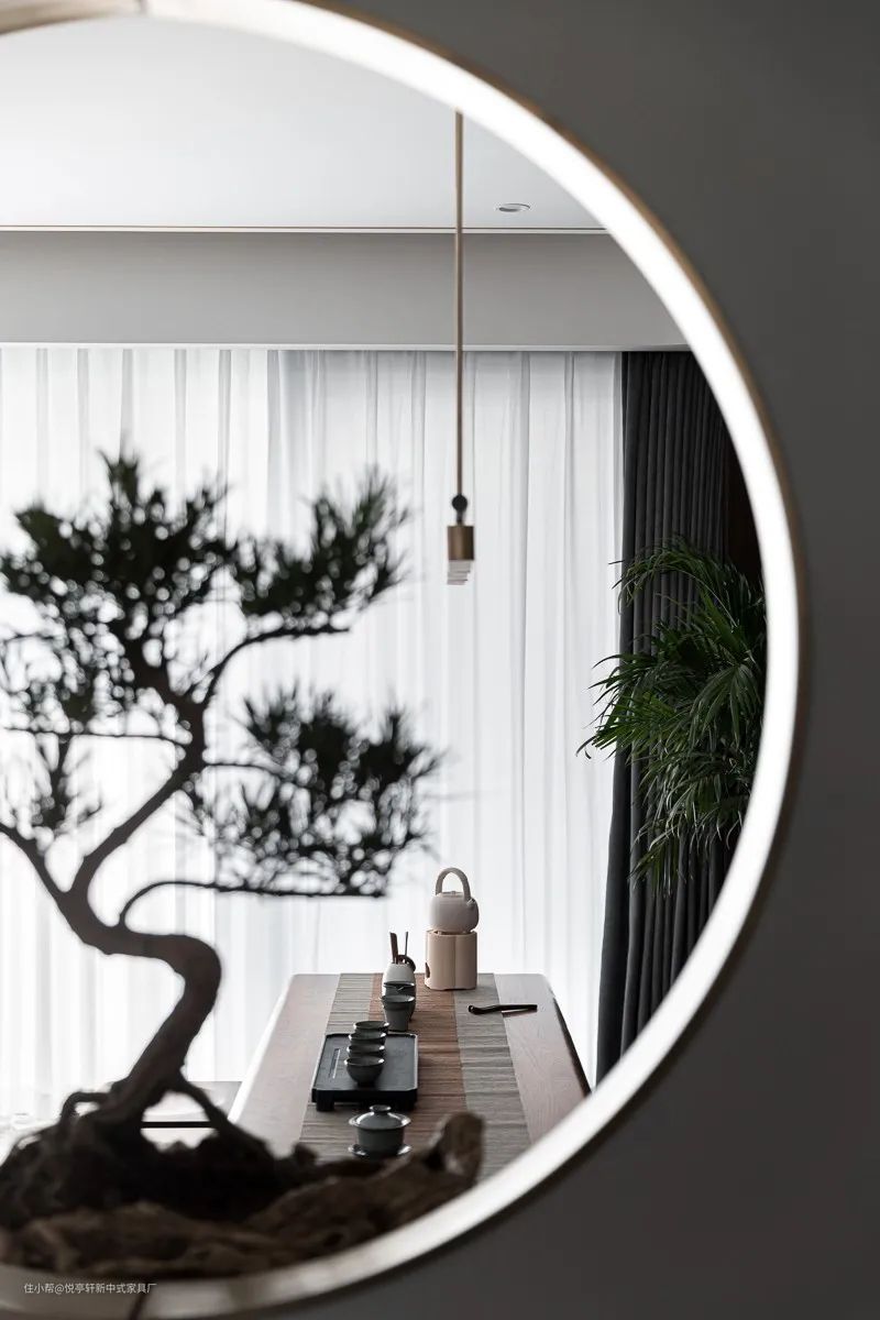 墙上的月洞窗下,一颗婀娜青翠的罗汉松盆景,便是最经典的中式美学,意境非凡。