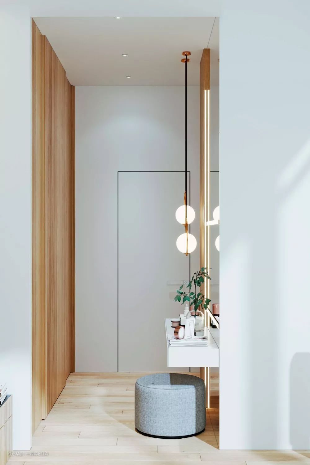 如果在玄关装了镜子,甚至是梳妆台,可以安装一个镜前灯(要暖白光)方便女主人整理妆容。