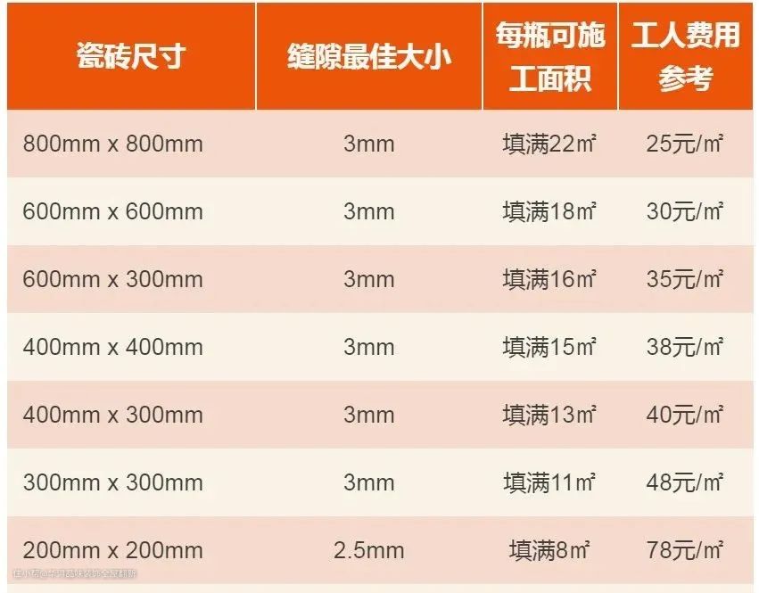 其实购买美缝的时候商家会帮你做估算。例如40㎡、800 x 800mm的瓷砖,按照一瓶600ml计算,大概要买4~5组。为了保险可以多买一组,自家马桶、浴室柜也可以用。