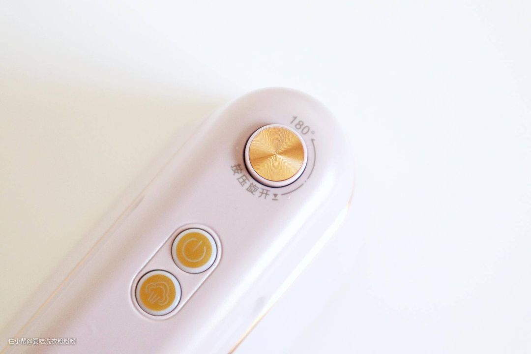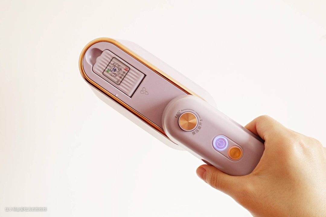 ▼熨斗顶部是手柄,上面有折叠扭,按下之后分别可以旋转90°和180°,多种手持姿势用起来更顺手呢。下面两个分别是开关键和蒸汽档位键,按下开关之后先是自加热,加热完之后就可以干熨啦,衣服定型更持久;如果想湿熨就按下蒸汽档位键,两档可用,抚平褶皱效果一流。