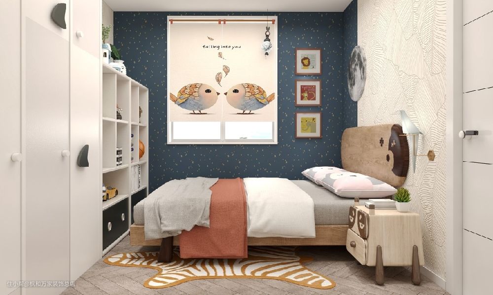 主卧延续设计的白色主色调,同时加进鸟造型和图案对设计的完整性进行延续和呼应。