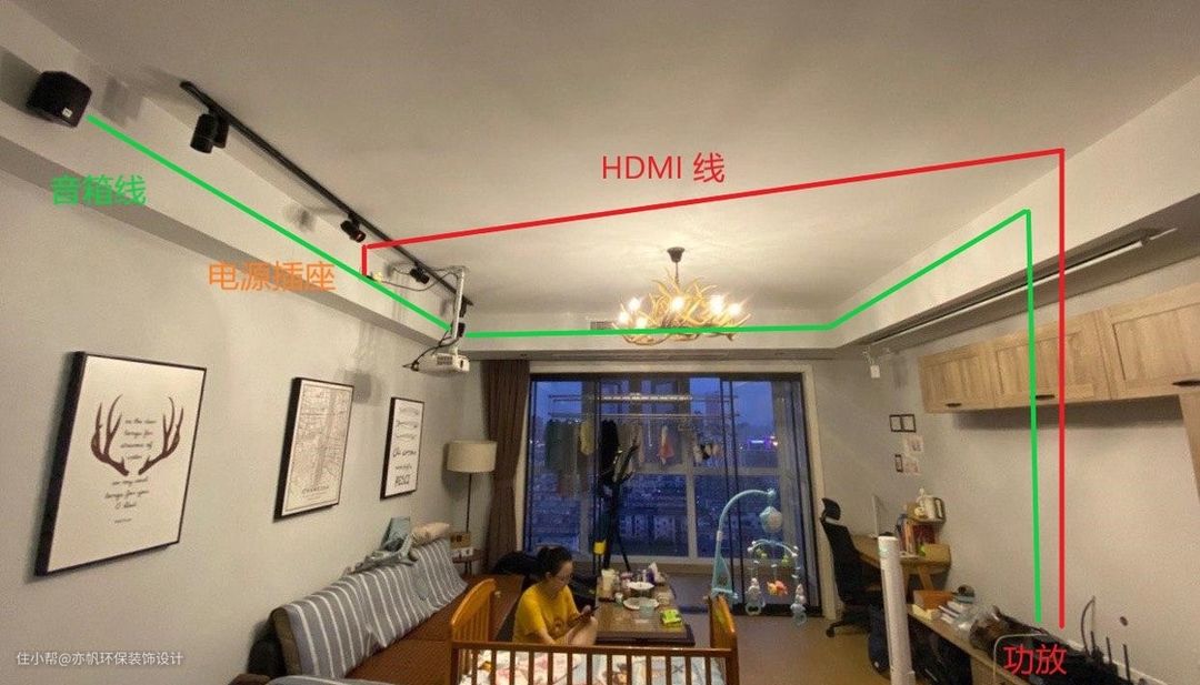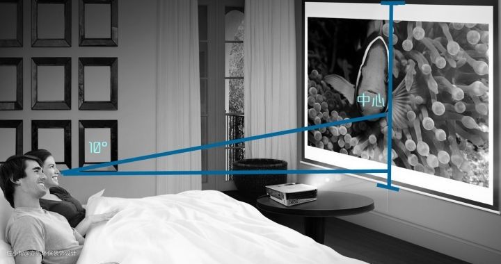 幕布的高度以观影人观影时的视线高度为准。无论坐着还是躺着,平时前方,再把头微抬一点,有点像军训站军姿时候的那个角度,然后目光聚焦的那一点,就是幕布的中心了。明确中心的高度之后,根据房高和幕布高度,就可以具体测算出幕布离地面需要多高了。