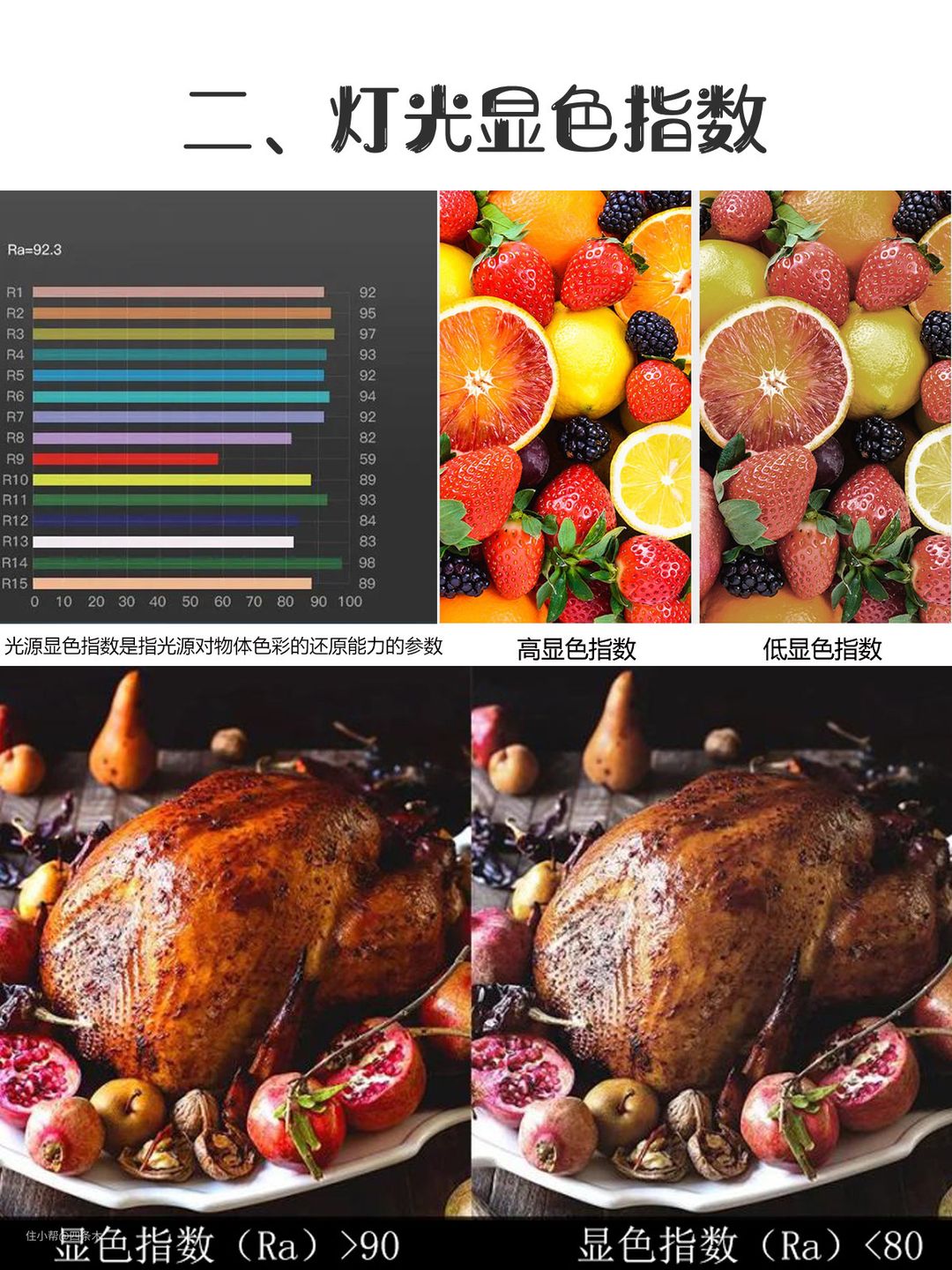 说起话长,大家记住这一点就好,选灯的显色性Ra >80的,例如餐厅灯选Ra85~90更佳。
