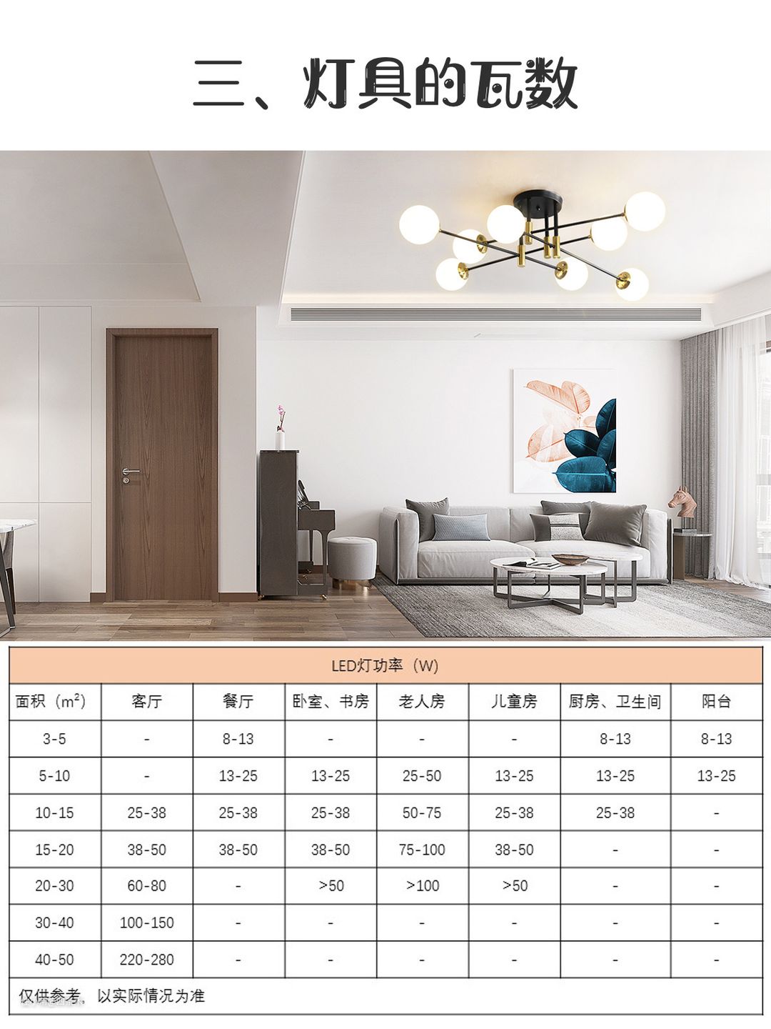 以100平房子来说,全屋以主灯设计为主,客厅可以选90-120W,房间选20-30W,如果你家是采用多光源照明的话,可以装多个5w、7w的筒灯,具体以实际情况为准。