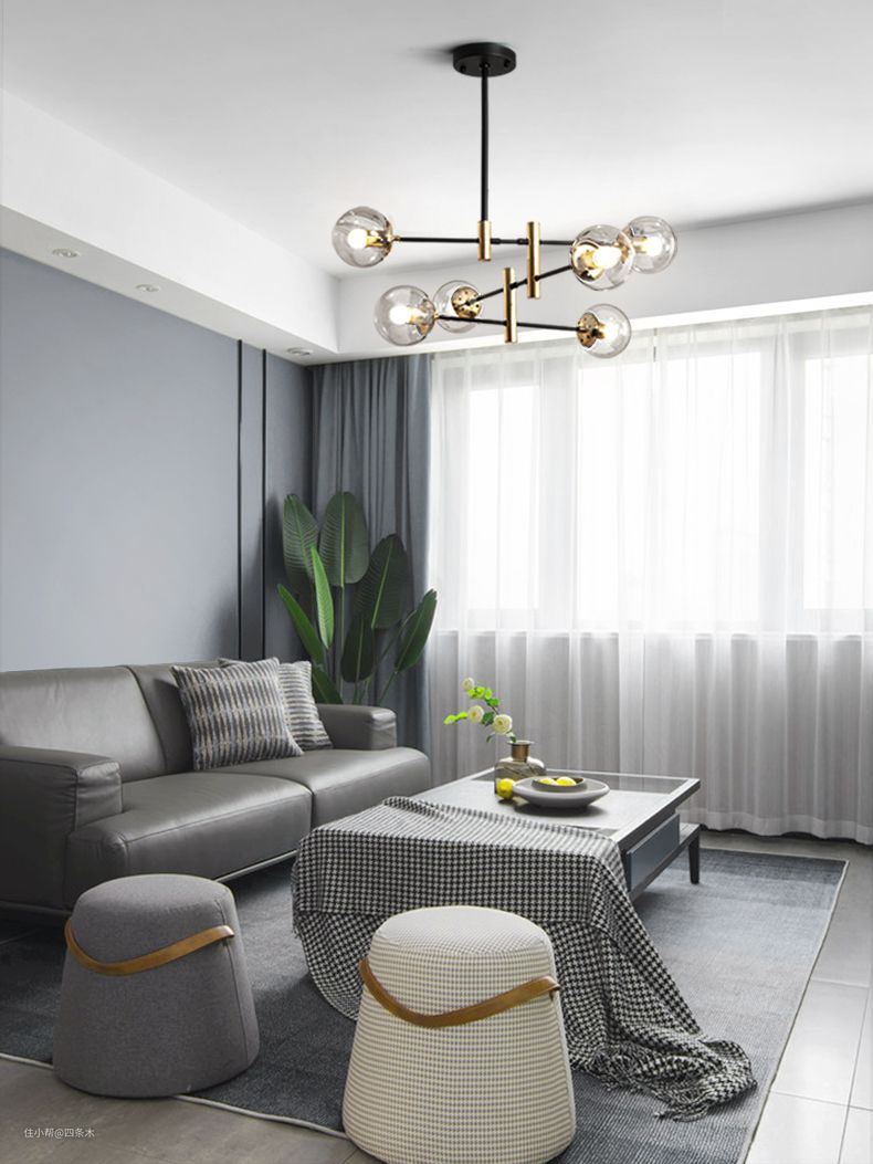 我挺喜欢魔豆灯,金色电镀拉丝铝材搭配高透玻璃灯罩,颜值很高,质感满满的,像我家的客厅大概20平方这样,选10头的灯就可以了。