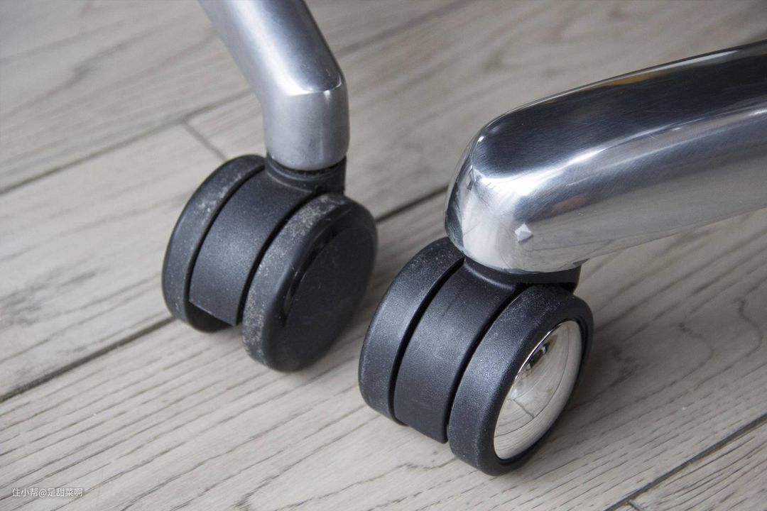 两款均采用pu滚轮,材料和质感没有太大区别,均适用于木地板,ergomax 使用一年多灵活性依然很高,我家地面铺的大自然纯实木(橡木)地暖地板(不是实木复合,是整块实木,传说中特别矜贵不耐操的那种),轮子每天在光滑的地板上摩擦摩擦超过10小时,地板耐磨层完全没有任何损伤。
