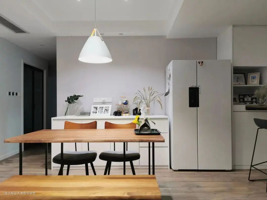 另外,现在为了让空间的利用率扩大,多会选择定制餐边柜,这样就可以考虑把冰箱嵌入到餐厅的餐边柜里面,取用也更加省心。
