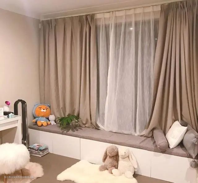 说到整体的美观性,窗帘盒自然是最佳的选择。但是,安装窗帘盒成本高,不够灵活,拉上窗帘显得空间没那么开阔。使用滑轨就很省钱,量好尺寸,网上订购,到货自己就能安装。