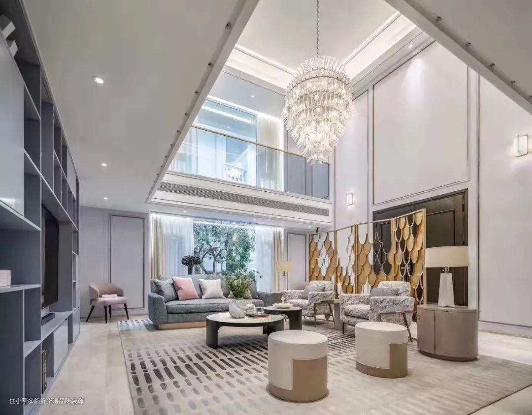 挑空客厅与普通客厅相比墙面一般都会比较高,为了避免整体空间的空泛感,可以考虑做一面主题墙或者整幅的挂画,花纹大理石、木质护墙板等材料进行铺陈。