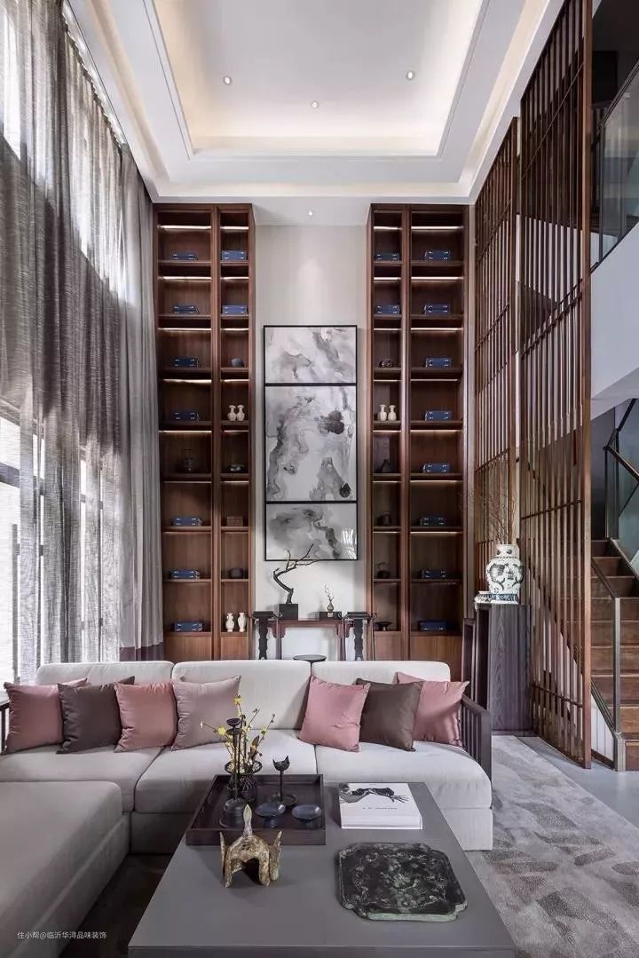 挑空客厅设计大气优雅的落地窗,使空间更加通透明亮。并且将室外的风景引入了室内,搭配书卷巍然的通顶书架,一杯咖啡、一本书,便能闲静整个午后。
