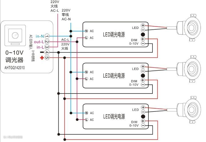 对于一个可以调光的LED灯具,至少包含调光驱动组件和发光组件,有的还更细分为调光组件、驱动组件和发光组件。例如下图的调光系统,调光器为0-10V调光器,驱动器即LED调光电源,之后接LED灯具。