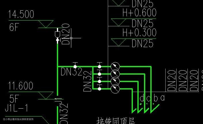 给水走向图是关于厨房、卫生间等处的给排水线路的布置图、给水管道的管径尺寸、取水位置及高度、管线排布系统等是该图的重点。在水路施工中要十分注重,要以此图为基础。