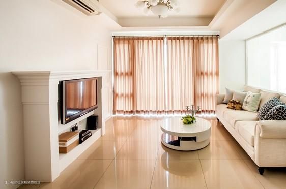 客厅的全景,这时候是白天,采光很好的。窗帘是大地色系的棉麻材质,茶几是旧家带过来的,连客厅的主灯都是▼