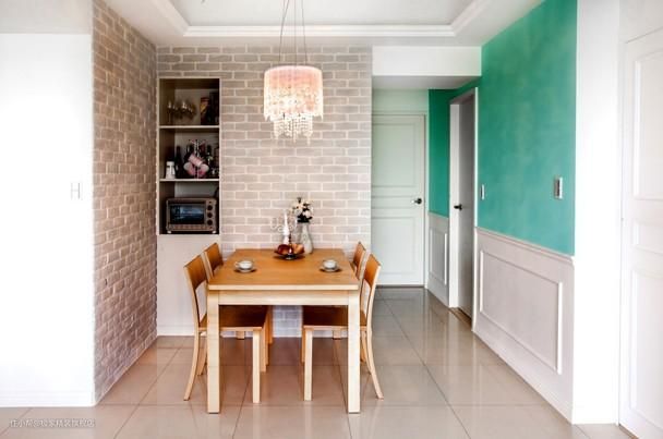 餐厅其实原本打算跟客厅的墙一样是白色的,只有两面贴文化石
