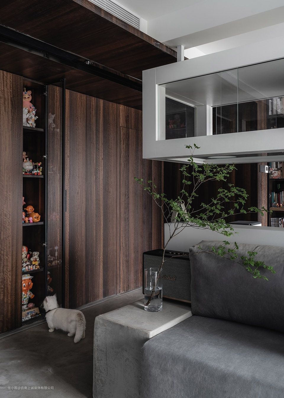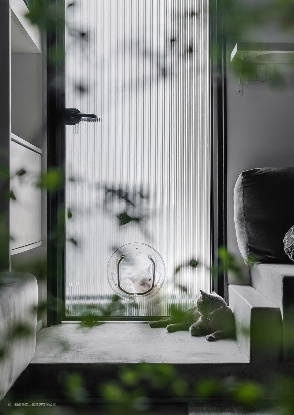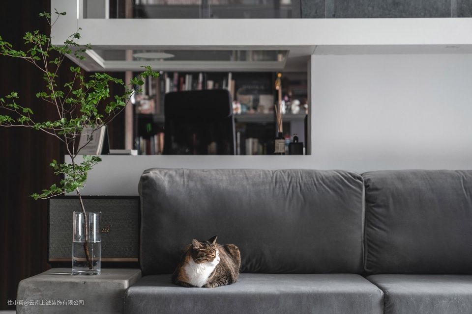 从平面上看,猫跑道让空间富有了环游性与趣味感。从断面上来看,跑道内部以及每一条通路上的洞口位置也是仔细分析猫咪行动路径后的结果。考虑到猫咪的生活习性,我们用定制的超白钢化玻璃打造了一个空中猫爬架,整个跑道有三条上下的通路。其中,从书桌的台面到上面的入口距离为60cm,这恰好是家里腿最短的那只猫能跳得上的高度。在跑道中靠墙一面都贴上了毛毡,配上另一面可推拉的玻璃门也方便清洁和更换毛毡。加厚不能敲掉的剪力墙体成一个小立柜,做成一条猫咪们的专属通道,既能用来隐藏插座,又能给猫咪们一个安心吃饭的空间。某一个不经意的瞬间,在工作中的业主如果抬头,一定能捕捉到好几个粉扑扑的肉垫悬浮于头顶。单向猫门的工艺非常复杂,为了方便它们在夜间行动,我们在墙体也制作了单向猫门。