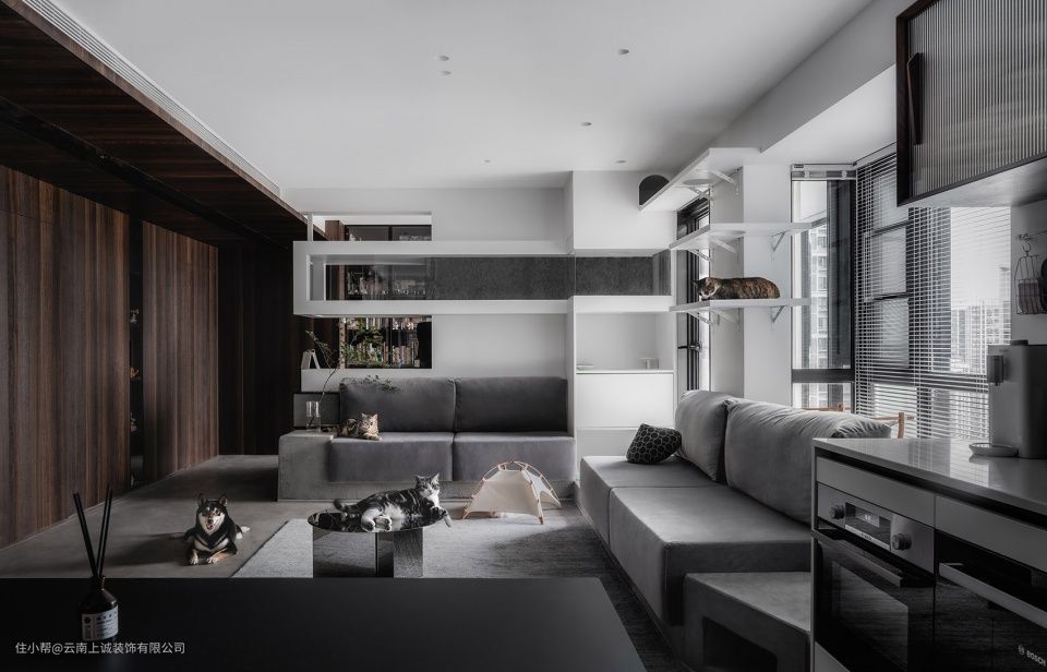 由阳台进入室内到地面有一定高差,正好利用沙发主体的延伸,在两者间形成一个过渡区域防止猫砂被带入客厅里。在沙发两侧的底部,分别挖出了两个小空间,一边用来放置宠物们的水碗,避免被踢翻的同时也提升空间的整洁度,一边则可以用来“躲猫猫”。