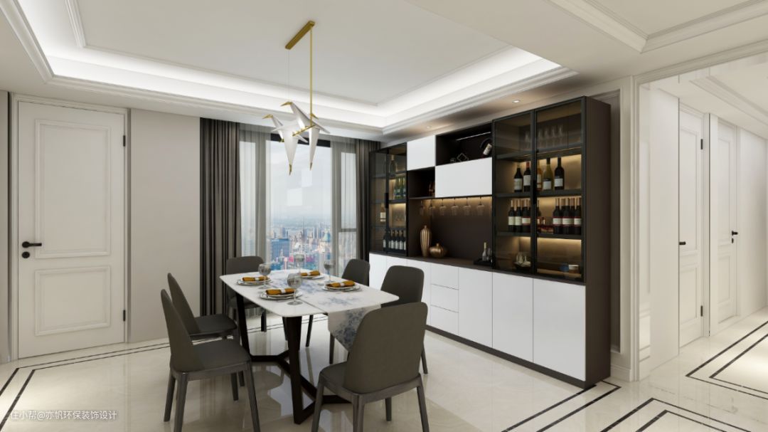 餐边柜设计特意留空,内嵌进了简约风的餐桌,增大了过道空间