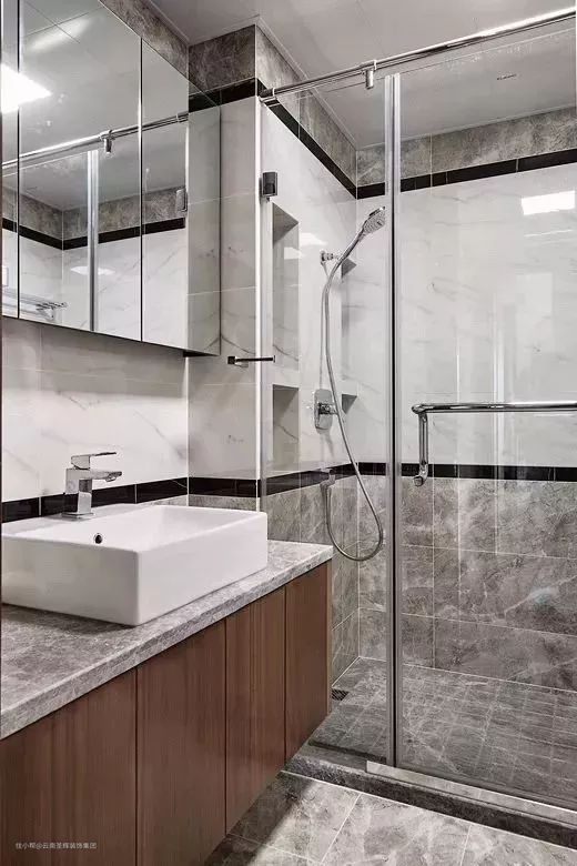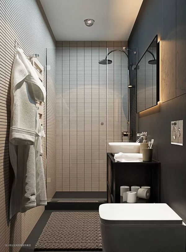 卫生间主要分为:洗漱台、马桶和淋浴区三个区域。长方形卫生间要做干湿分离,可以根据洗手台-马桶-淋浴区一字排开的顺序来布局。