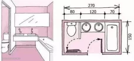 按照洗手台、马桶和淋浴区最小尺寸计算:淋浴区宽度90cm;马桶宽度75cm,洗手盆宽度85cm,外加间隔70cm,卫生间长度在3.1m左右就可以按照顺序做干湿分离。