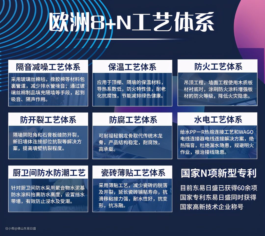 东易日盛在原有施工工艺基础上进行全新探索和挖掘,推出欧洲8+N工艺体系。并且,通过创新性的技术研发和技术创新,东易日盛完善了100余项施工工序,500余个控制节点,研发了55项新型专利,更率先在行业内成立了技术监察部,使得整个工程项目管理体系更完备。