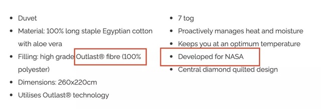 比如NASA款Outlast纤维被子,聚酯纤维,航空级高级。