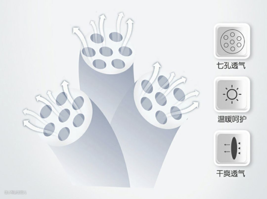 为了让聚酯纤维更弹、板结慢一点,会把它做的更细;为了更透气蓬松,会在纤维上打孔。