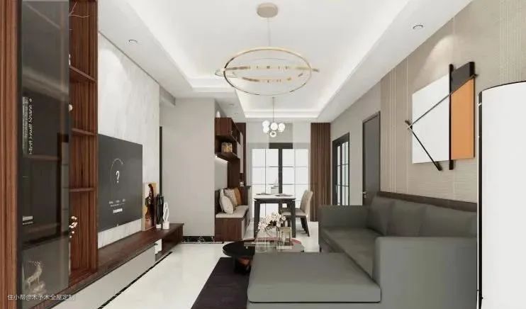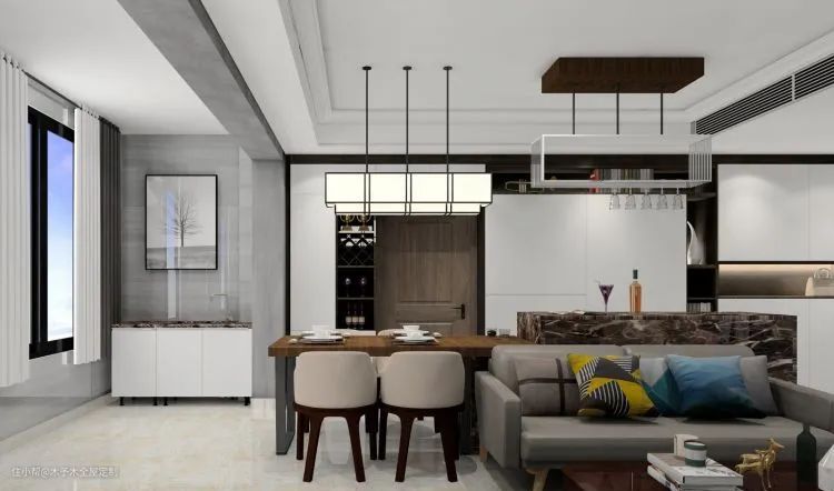 将吧台与餐桌结合设计,美观实用,还可以满足由于面积较小而没有独立餐厅的户型,超节省空间。
