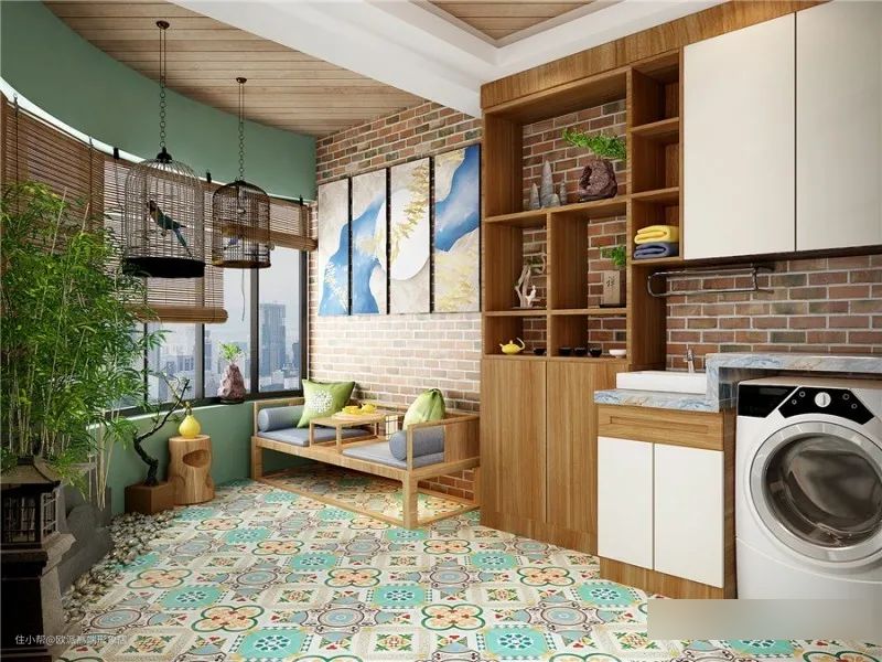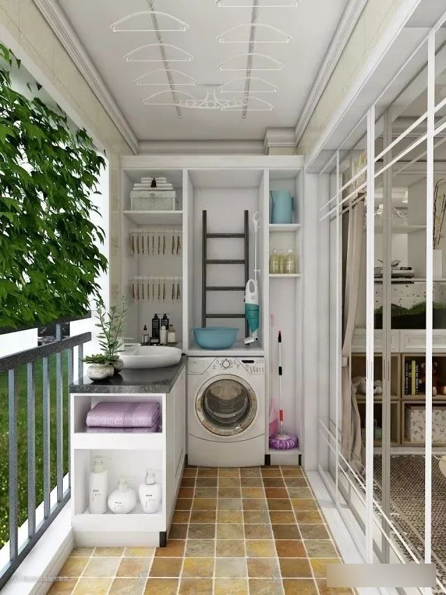洗衣机放浴室怕受潮?放厨房又占地方?不妨把洗衣空间挪到阳台上来吧,即洗即晾,超方便。