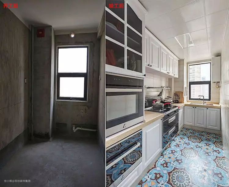 厨房是定制L型整体橱柜,西面墙一排上下柜,靠左边上下组合高柜,内嵌蒸箱。地面蓝色咖色组合的花纹砖铺贴,厨房颜值美感独特很多。