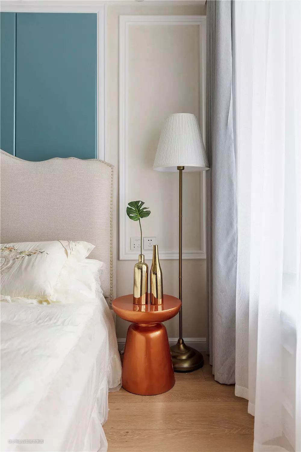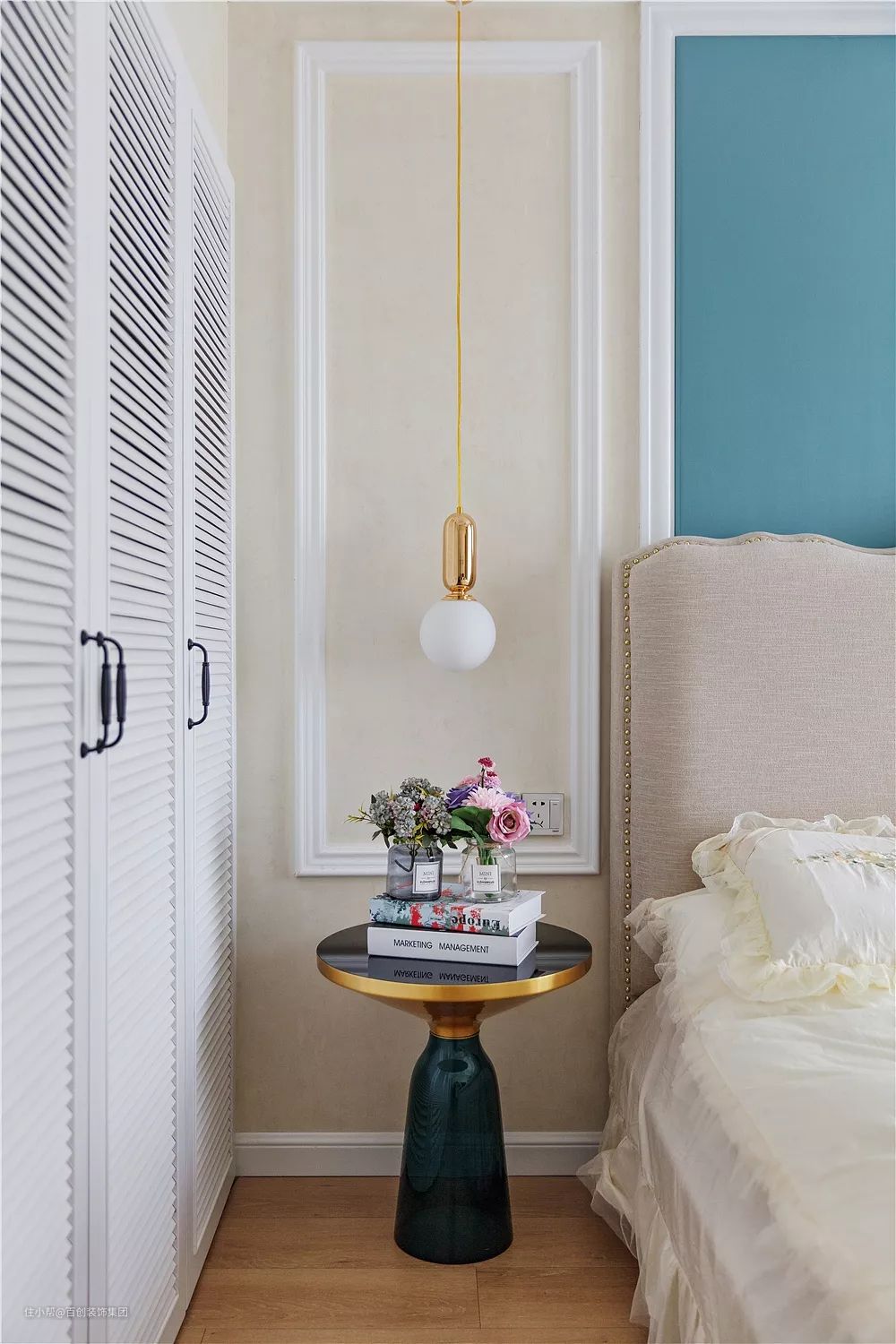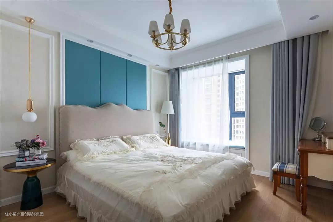 床头蓝色软包,白色木线框勾边,1800*2000的大床,左边金色吊线灯,右边落地灯。满足不同场景的氛围照明,白色蕾丝床品选配是女主内心喜爱,少了一些美式的标准,多了一些少女心的可爱。