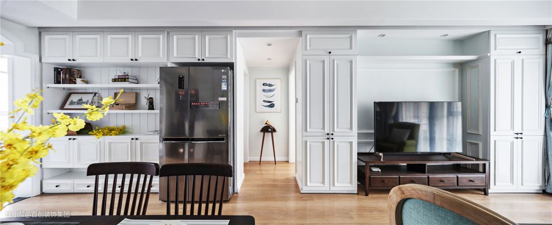 原次卧室和主卧室的门封闭,次卧门洞嵌入冰箱与左边收纳柜形成装饰一体,主卧室门封闭做成装饰柜,与右边储藏柜形成对称感极强的电视墙,整个餐厅与客厅立面装饰用灰色形成一体,视觉整体更宽敞。