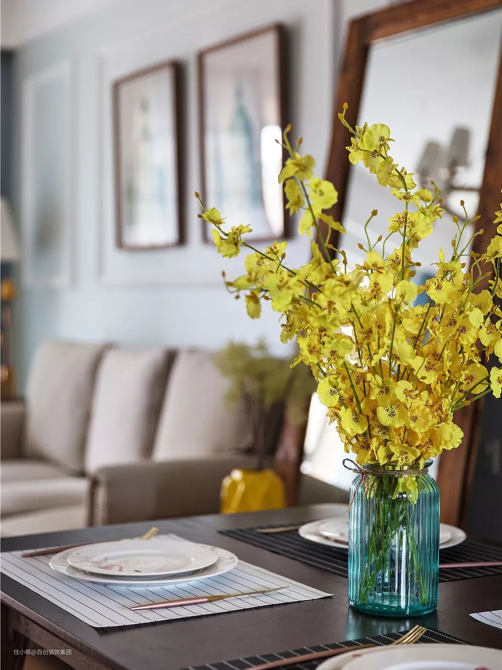 客厅与餐厅之间增加一块木质边框镜,增加客餐厅透视画面感,同时作为全身镜,梳妆使用非常方便。
