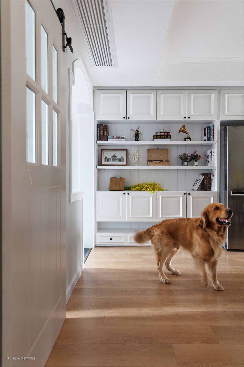 厨房用吊装谷仓门,铁艺+白色木门美式感十足。卫生间干区墙拆掉做成半高墙,与拱形门洞形成装饰面,湿区用木框玻璃门,整个干区不再拥挤、采光视觉极好。