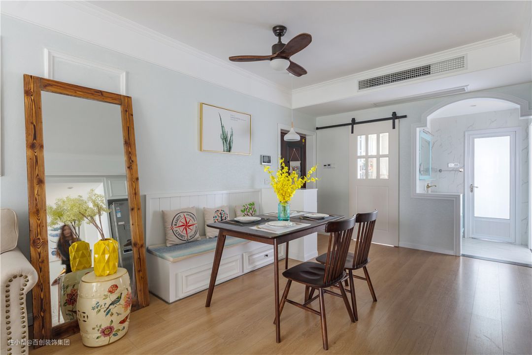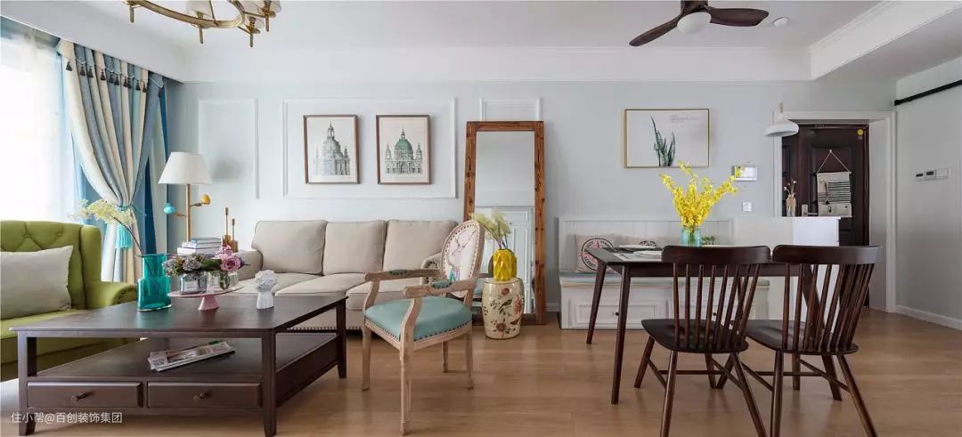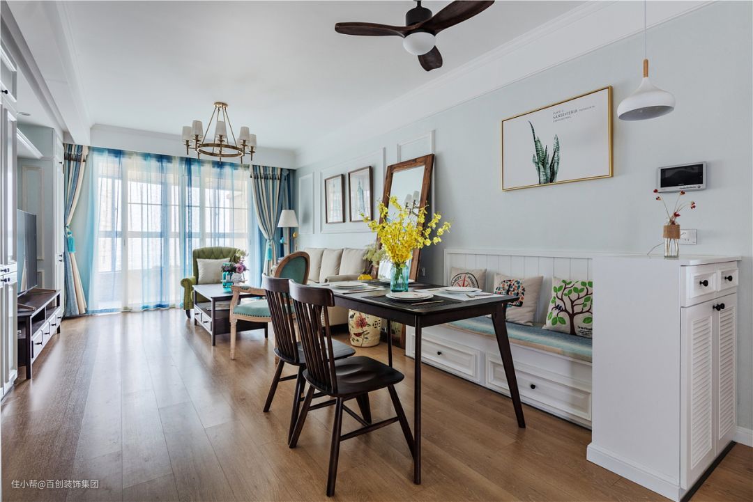 沙发区和餐厅卡座区统一用浅蓝色乳胶漆做背景,配上白色石膏线框,加上美式装饰画,层次丰富雅致。三人座沙发米色布艺材质,茶几+餐桌+餐椅+吊扇灯统一用深色实木材质,互相呼应,整个地面用橡木色地板平铺,提亮整个空间的明亮度。