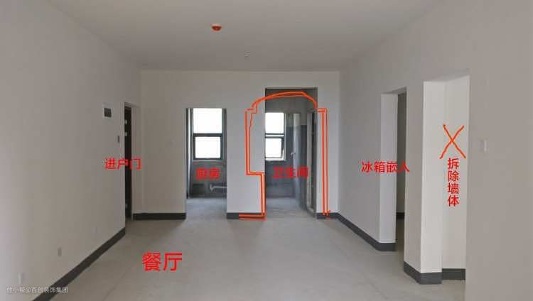 餐厅北面是厨房与卫生间的门,原始门洞高低不同,直接僵硬,毫无视觉美感。