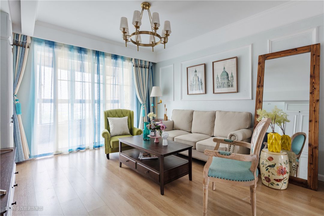 在设计过程中反复沟通,风格上女主人喜欢美式的温馨,又喜欢冷静的颜色。最终呈现出现在的样子,淡蓝色的背景下有美式的自然木色和温馨,冷暖色对比恰到好处,深受她的喜爱。