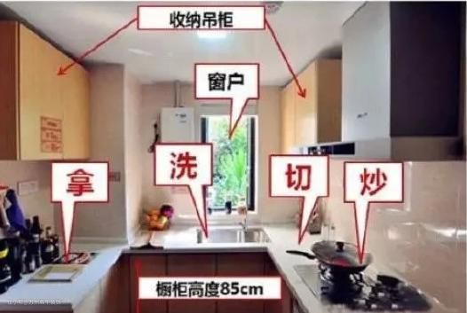 1、厨房的动线布局:厨房的动线布局是非常重要的,合理的设计了动线布局,做起饭来才会感觉倍觉轻松,让人爱上做饭。动线设计是根据做饭的顺序来的,正确的顺序是:拿菜——洗菜——切菜——炒菜,灶台布局就是根据这条线来。