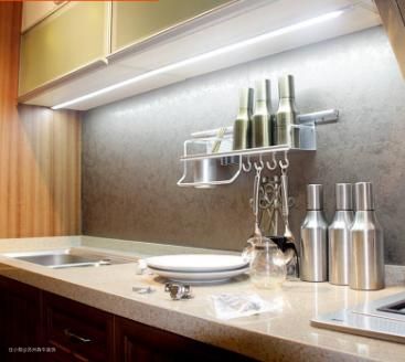 4、吊柜底部装灯:台面上方有吊柜,切菜时可能会影响视线,在吊柜底部装灯,光线充足,切菜也更方便。