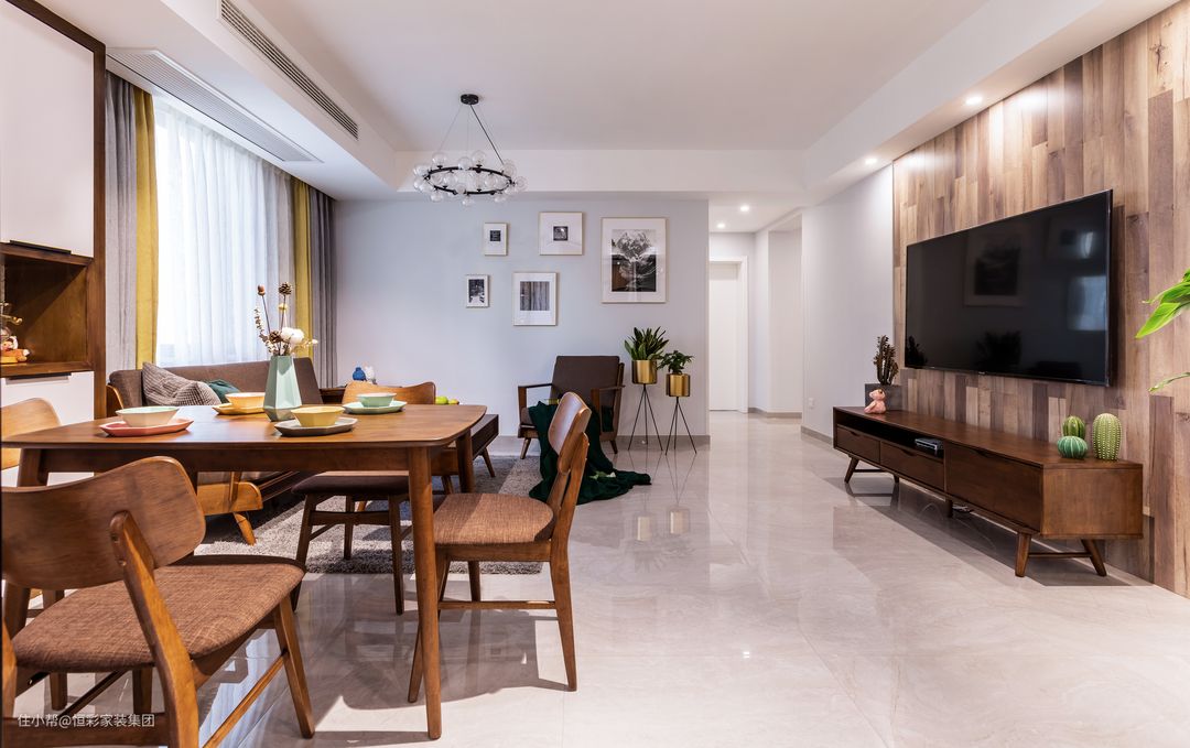 木质背景墙也越来越常见,一般分为地板上墙、木饰面、隔断等。木板材质轻盈,清新自然,一般用于北欧风家居比较多。