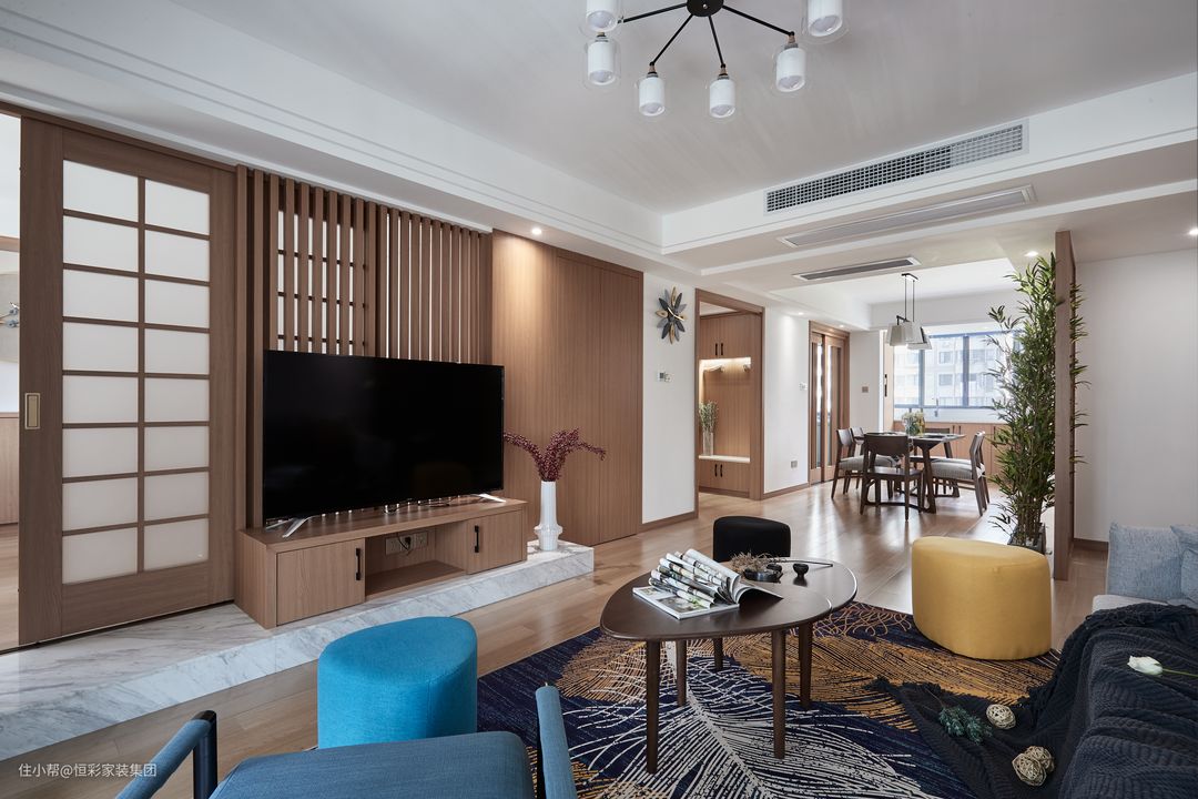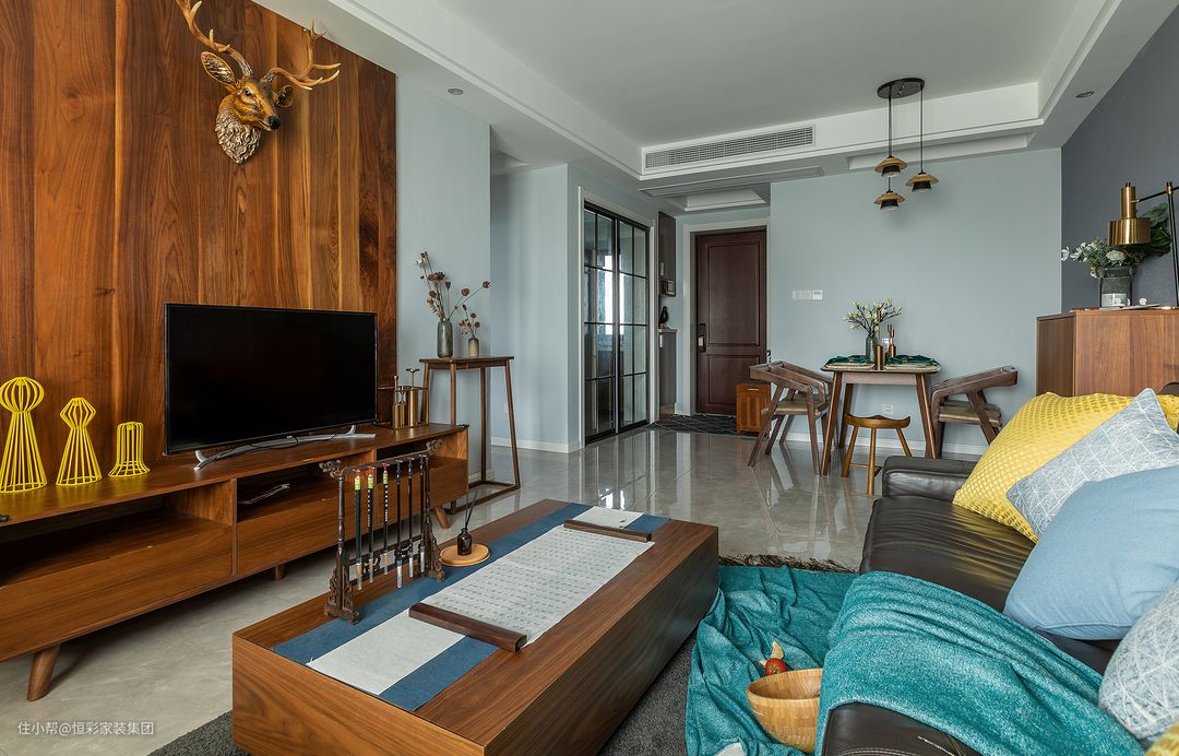 ▲ 木饰面加隔断的方式作为电视机背景墙也十分个性,搭配整个原木风的设计,质感十足。