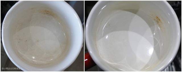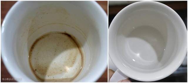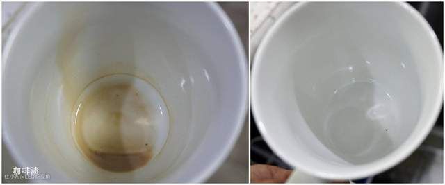 两个都是陶瓷的咖啡杯,都是同样底部有咖啡渍残留,两款洗碗机清洗效果都非常不错,洗完后都几乎和新的可以媲美。