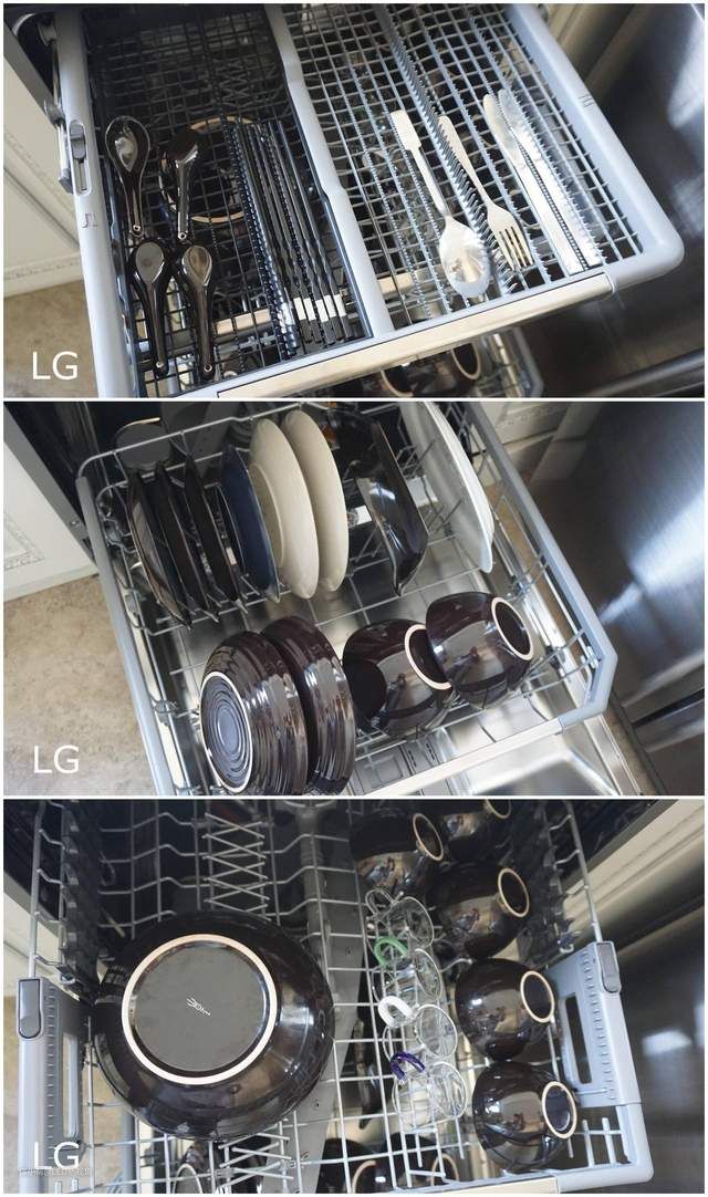 找了家里几套不同尺寸的碗盘,应该说西门子的洗碗机在按照要求摆放的情况下,三口之家的碗盘完全是可以容纳的下的,但筷笼的设计是个败笔,不仅占用过大的空间,竖放也影响部分筷子和刀叉的清洁效果。而LG洗碗机,则对于更多不规则的碗盘更友好,不用可以的紧凑摆放,再多点的碗盘都可以。当然,毕竟LG是14套洗碗机,容量相对也会更大一些。
