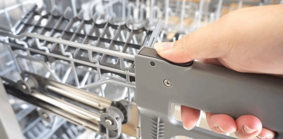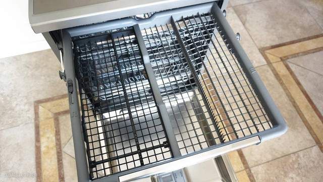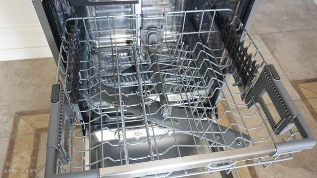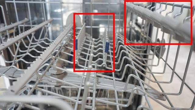 在二层的拉篮边缘,多了两个类似把手的设计,两手辅助两边的把手,然后按压就可以调节这边的拉篮高度,如果有更大的物品需要洗碗机清洗,比如油烟机的网罩,大的锅、盆之类的,就可以提起二层拉篮,让底层的拉篮空间更大。但西门子并没有类似的设计,这点上LG更胜一筹。