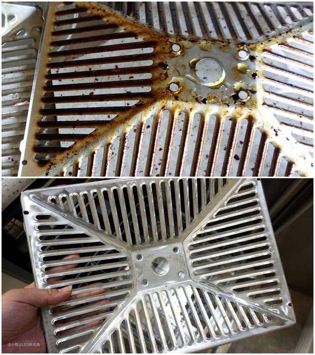 油烟机油网内外两层,LG清洗的内侧油网,油污更重,面积更大,而西门子的外侧油网,因为日常有表面的清洗,仅在底部有较厚的油污。不过实际清洗后,LG的实际效果要好于西门子,肉眼可见对比效果。