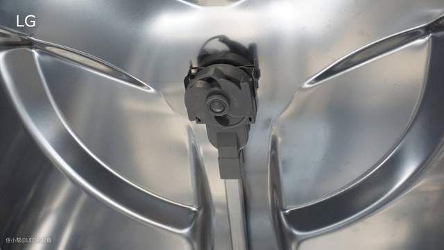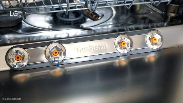 LG的喷淋臂分为顶喷、中臂和底部十字喷淋臂,另外还增加100℃ True steam的设计,就是在门上底部有四个蒸汽发生器,在清洗过程中,可以喷射100℃高温蒸汽,这个也是目前LG洗碗机独有的一个设计,在选购时LEO通过资料了解,此前市面上的洗碗机蒸汽最高只能达到80℃。