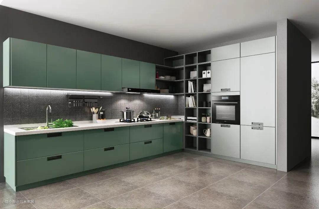 烟机吊柜的设计弱化了油烟机的存在,让它与厨房形成了一个整体。莫兰迪色让烟火气息浓重的厨房多了一份静谧与美好。