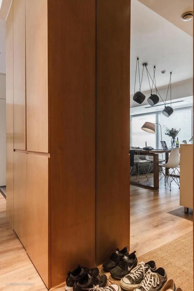 入户区域相对比较狭小,设计师没有在这里做太多遮挡,仅仅布置了一个鞋柜和一个换鞋软垫,创造了一个比较宽敞的开门感受。