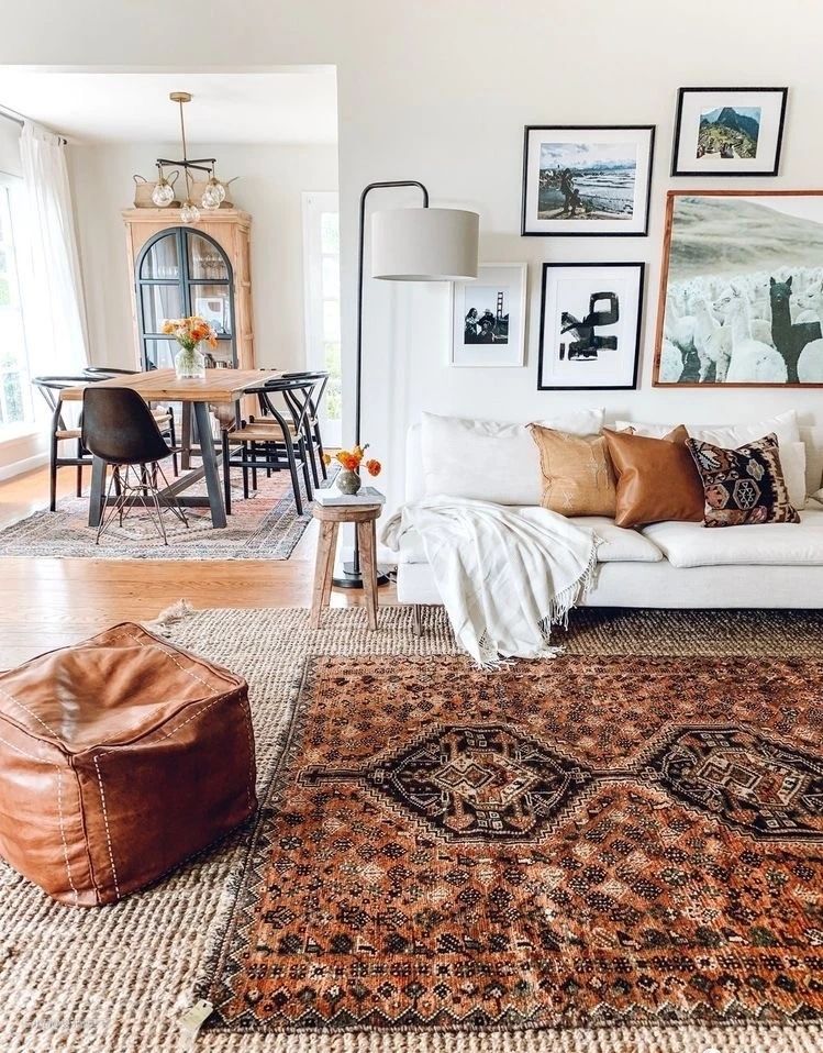 叠加搭配也是比较流行的一种地毯搭配方式。如果空间比较大,想要更有造型感。可以选择纯色加花色地毯搭配或者花色+异形搭配。