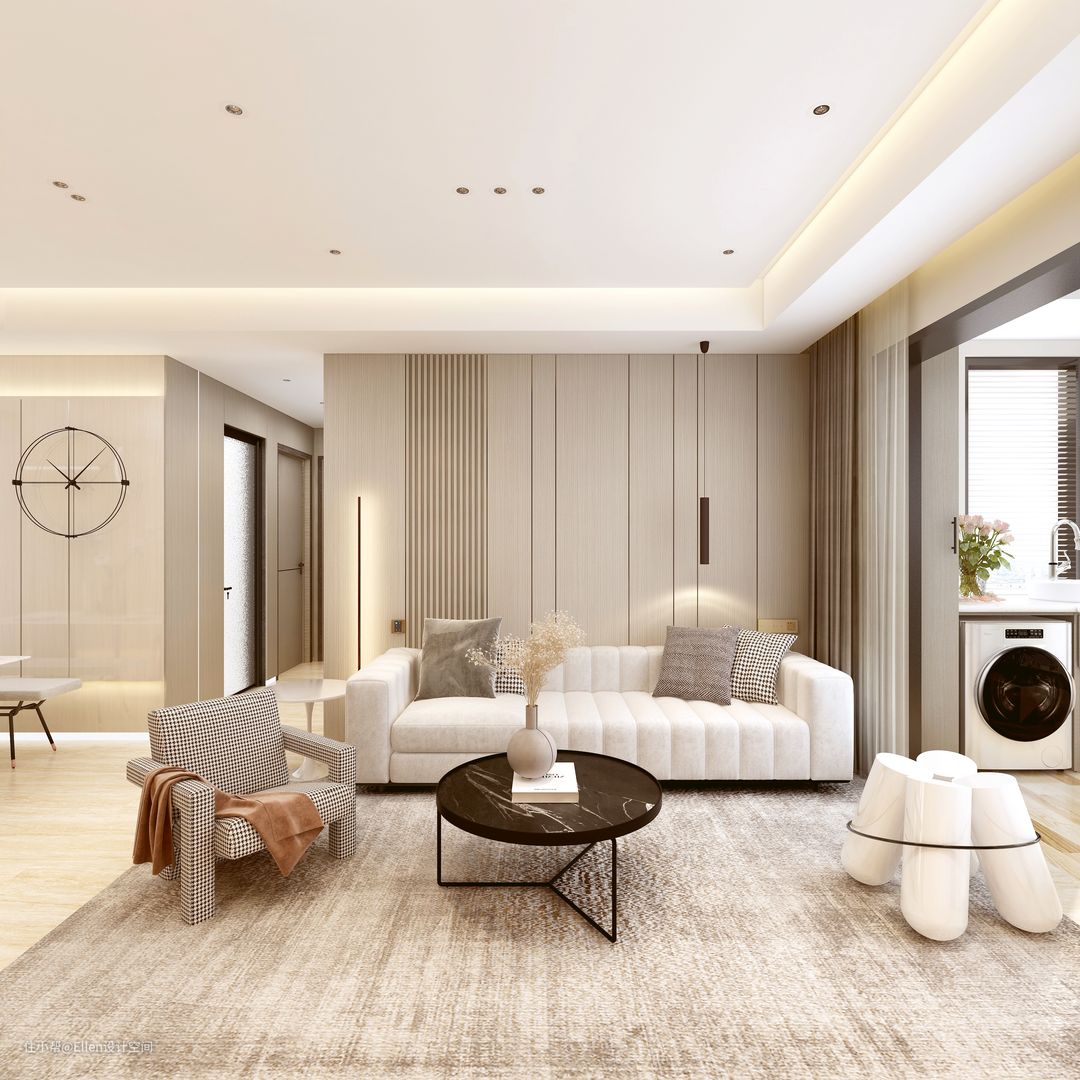 沙发旁的边几,是白色烤漆未来感曲线边几。搭配上黑色的极简落地灯,搭配上黑白相间的千鸟格布纹,搭配上地面线条糅杂明暗斑驳纹理的地毯,让每一处都充满随性的睿智和兼容。
