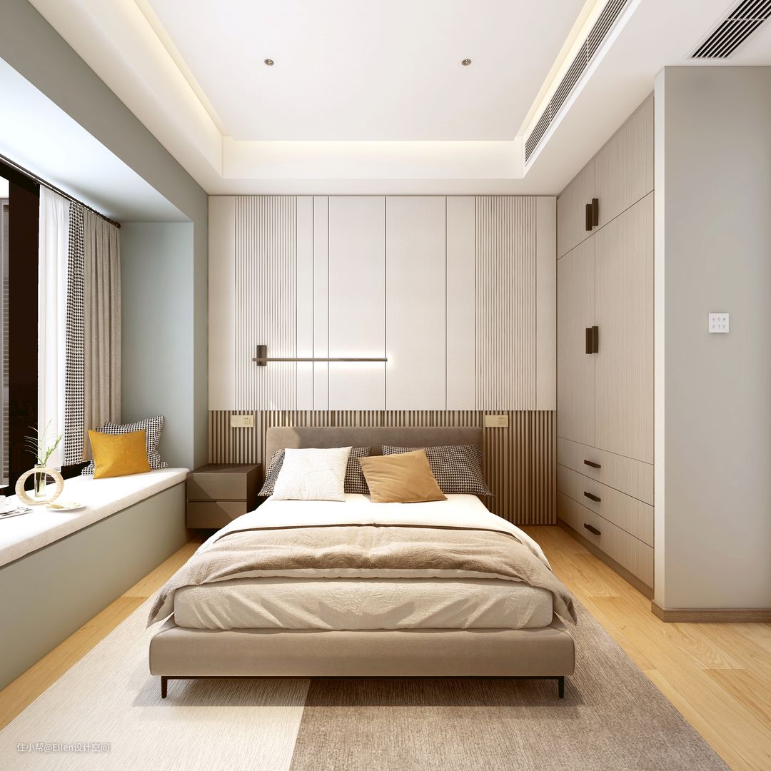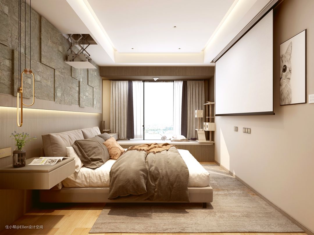 客卧色彩治愈安静,酸甜的橙色点缀空间作为跳色,带来温暖的氛围。背景墙属于木格栅和墙板材质,温润的木质材质外加极简黑色灯具的照射洗礼,满满的视觉档次的提升。